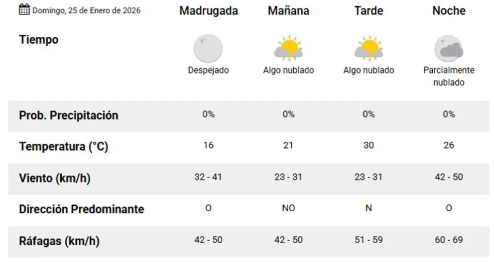 Durante la madrugada, la temperatura se situará en los 16°C con cielo despejado. En el transcurso de la mañana, el termómetro ascenderá hasta los 21°C, bajo un cielo algo nublado y ráfagas leves provenientes del oeste que oscilarán entre los 42 y 50 kilómetros por hora.