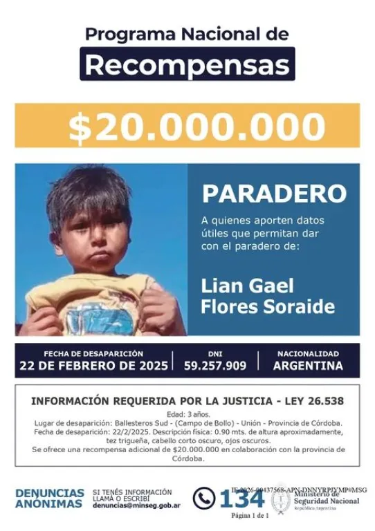 En relación a la desaparición de Lian, ocurrida el 22 de febrero de 2025 en Ballesteros Sud durante la tarde, la cartera de Seguridad había establecido inicialmente un monto de $10 millones. Debido al tiempo transcurrido y la necesidad de obtener testimonios significativos que permitan destrabar la investigación, el Gobierno Nacional decidió elevar la recompensa también a $20 millones.