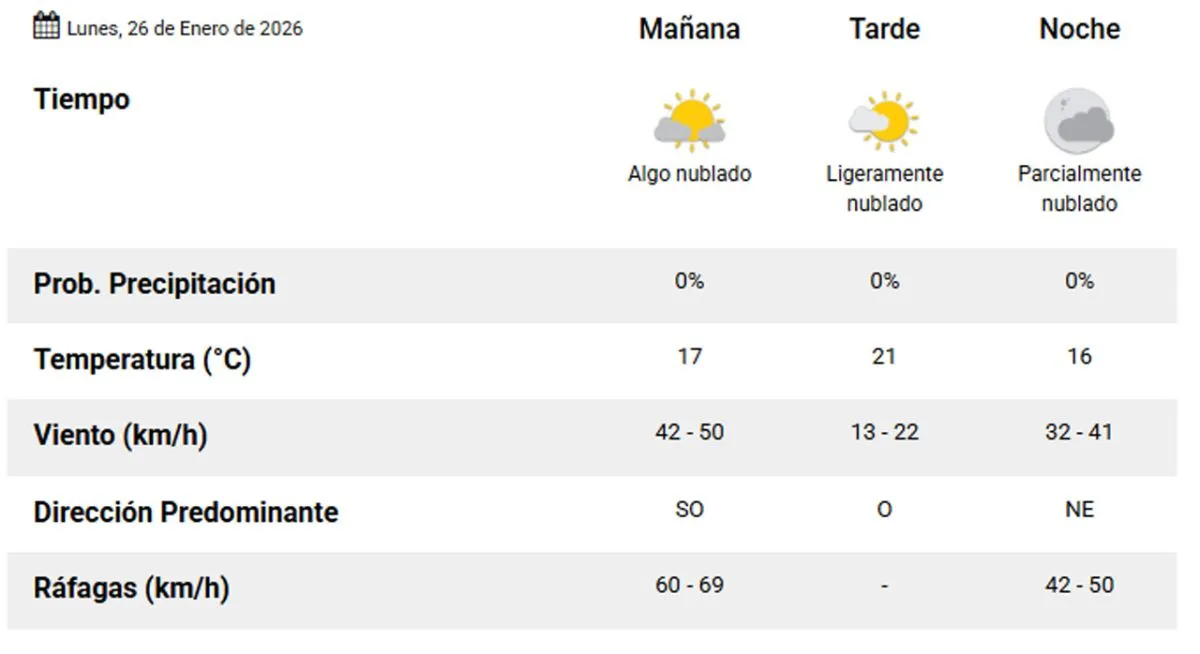 Durante las primeras horas del día, el tiempo se mantendrá estable, sin lluvias, con vientos fuertes del oeste y una humedad cercana al 38 %.