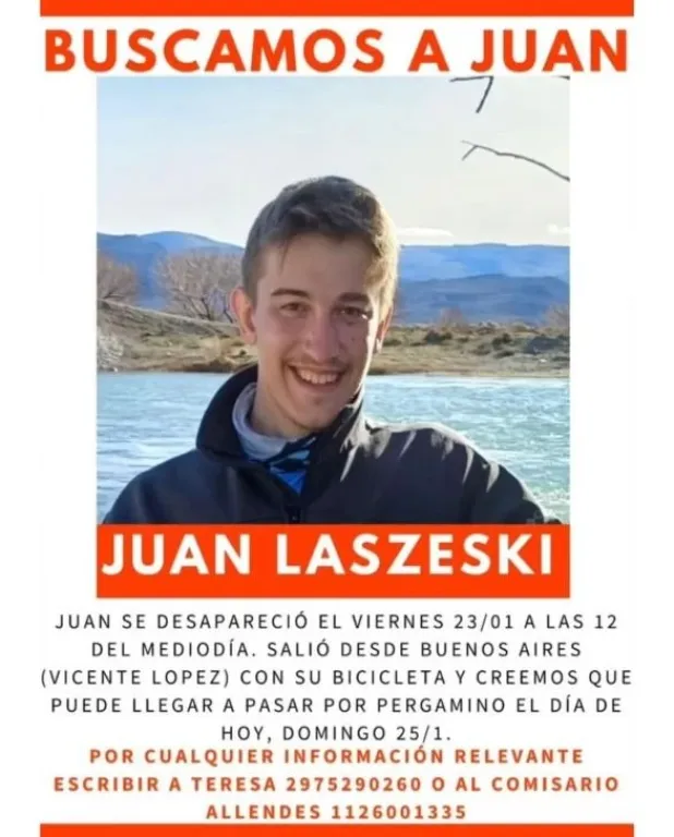 La desaparición de Juan Laszeski, un joven chubutense de 21 años, mantiene en vilo a su familia desde el viernes 23 de enero, cuando salió en bicicleta desde su domicilio en el partido bonaerense de Vicente López y no volvió a comunicarse.