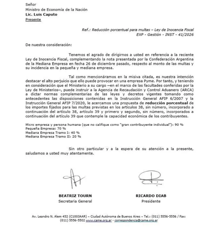 La Confederación Argentina de la Mediana Empresa (CAME) envió una propuesta al ministro de Economía, Luis Caputo, para que instruya a la Agencia de Recaudación y Control Aduanero (ARCA) a reducir las multas previstas en la Ley de Inocencia Fiscal.