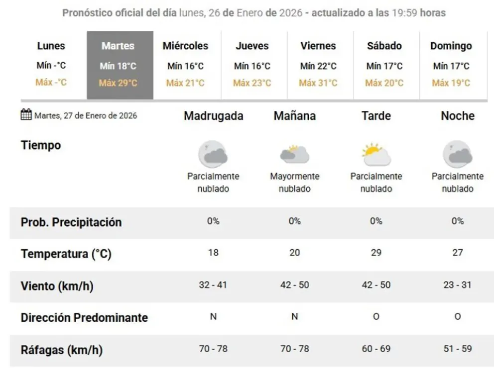 El factor predominante del día será el viento proveniente del sector norte. Durante la mañana, se esperan ráfagas que oscilarán entre los 70 y 78 km/h.
