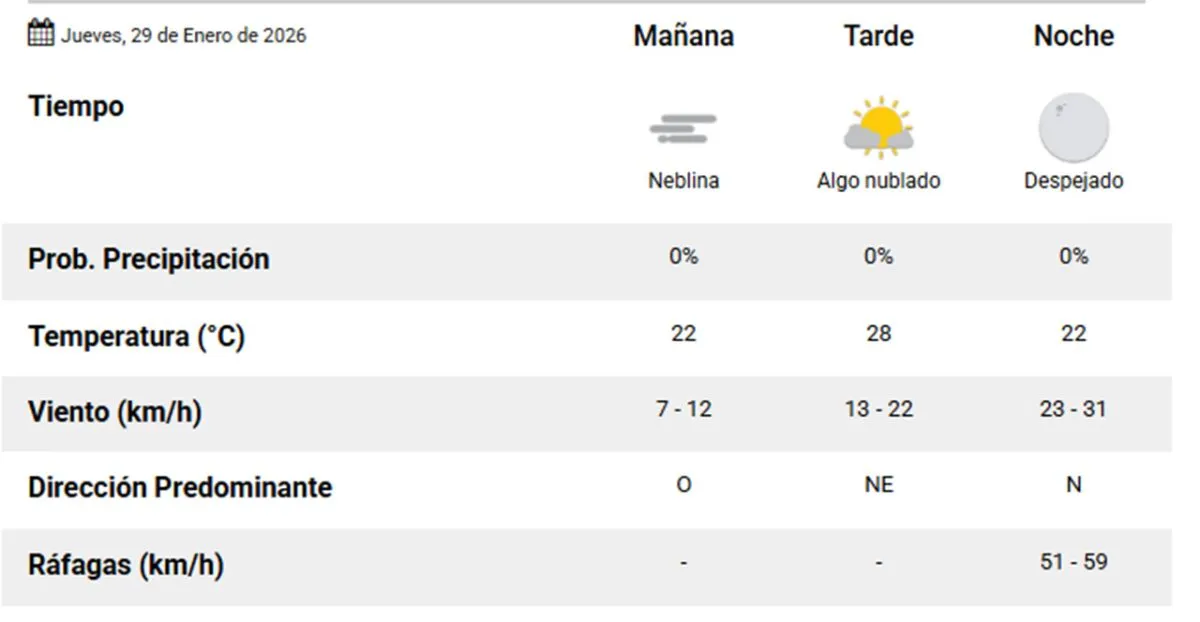 Para la tarde, se espera que continúe el cielo algo nublado, con vientos del sector noreste que oscilarán entre 13 y 22 km/h. La temperatura máxima prevista es de 28 °C.