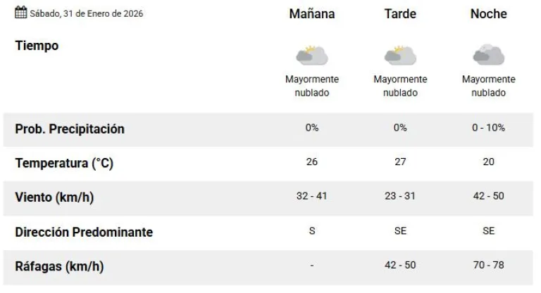 Según el informe del Servicio Meteorológico Nacional, no se esperan lluvias a lo largo del día. Los vientos del sur soplarán entre 32 y 41 km/h, con una humedad estimada del 64 % y buena visibilidad en la ciudad.