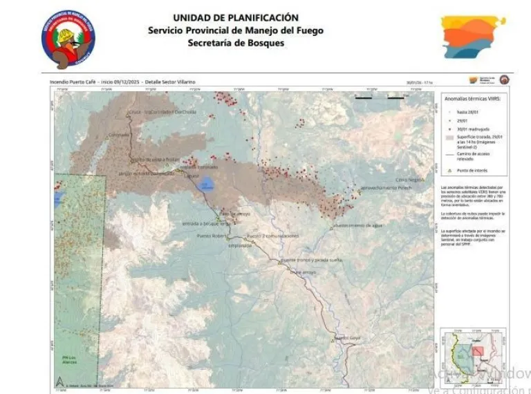 Según datos del Servicio Provincial de Manejo del Fuego, durante el viernes los focos permanecieron activos en la zona de Laguna Villarino, donde se realizaron tareas de enfriamiento y apertura de fajas, con apoyo de medios aéreos y maquinaria vial.