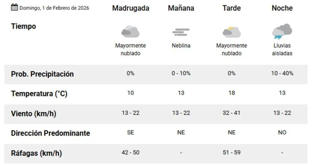Según el pronóstico, la madrugada del domingo iniciará con cielo mayormente nublado y una temperatura estimada en 10 grados. Se registrará viento leve del sudeste con ráfagas que oscilarán entre los 42 y 50 kilómetros por hora.