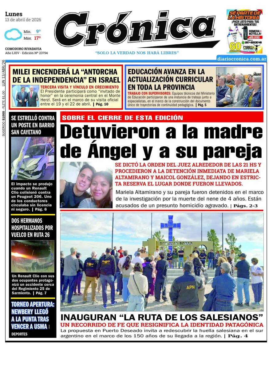Actualidad Lunes 13 de abril de 2026 lunes 13 de abril de 2026 Te puede interesar Atacaron a piedrazos un micro con niños y uno resultó herido en el ojo Comodoro Rivadavia se prepara para recibir al Foro Provincial de Concejales 2026 El papa León XIV respondió a las críticas de Donald Trump Falleció el periodista Julio Ricardo a los 85 años Por qué se celebra hoy el Día Internacional del Beso Hallan un cuerpo oculto dentro de una pared en Entre Ríos Cronograma de regreso progresivo a las aulas en San Cristóbal Docentes de la UNPSJB inician una semana de paro total Últimas noticias Atacaron a piedrazos un micro con niños y uno resultó herido en el ojo Comodoro Rivadavia se prepara para recibir al Foro Provincial de Concejales 2026 El papa León XIV respondió a las críticas de Donald Trump Falleció el periodista Julio Ricardo a los 85 años Por qué se celebra hoy el Día Internacional del Beso Hallan un cuerpo oculto dentro de una pared en Entre Ríos