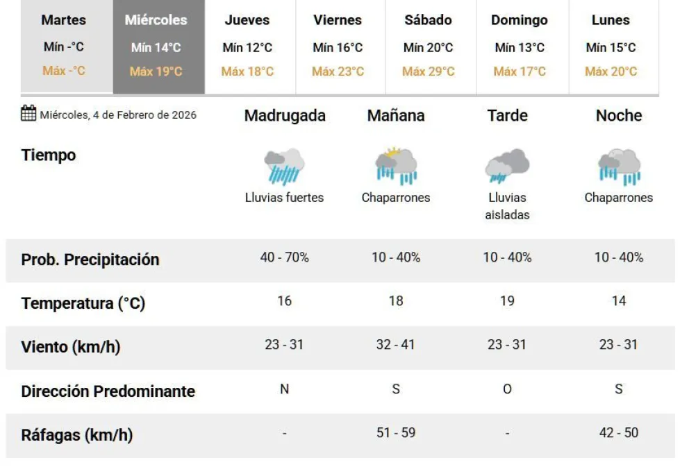 Desde el Servicio Meteorológico Nacional informaron que se esperan fuertes lluvias para este miércoles a la madrugada con probabilidad alta de entre un 40 y un 70 %, con viento del norte.