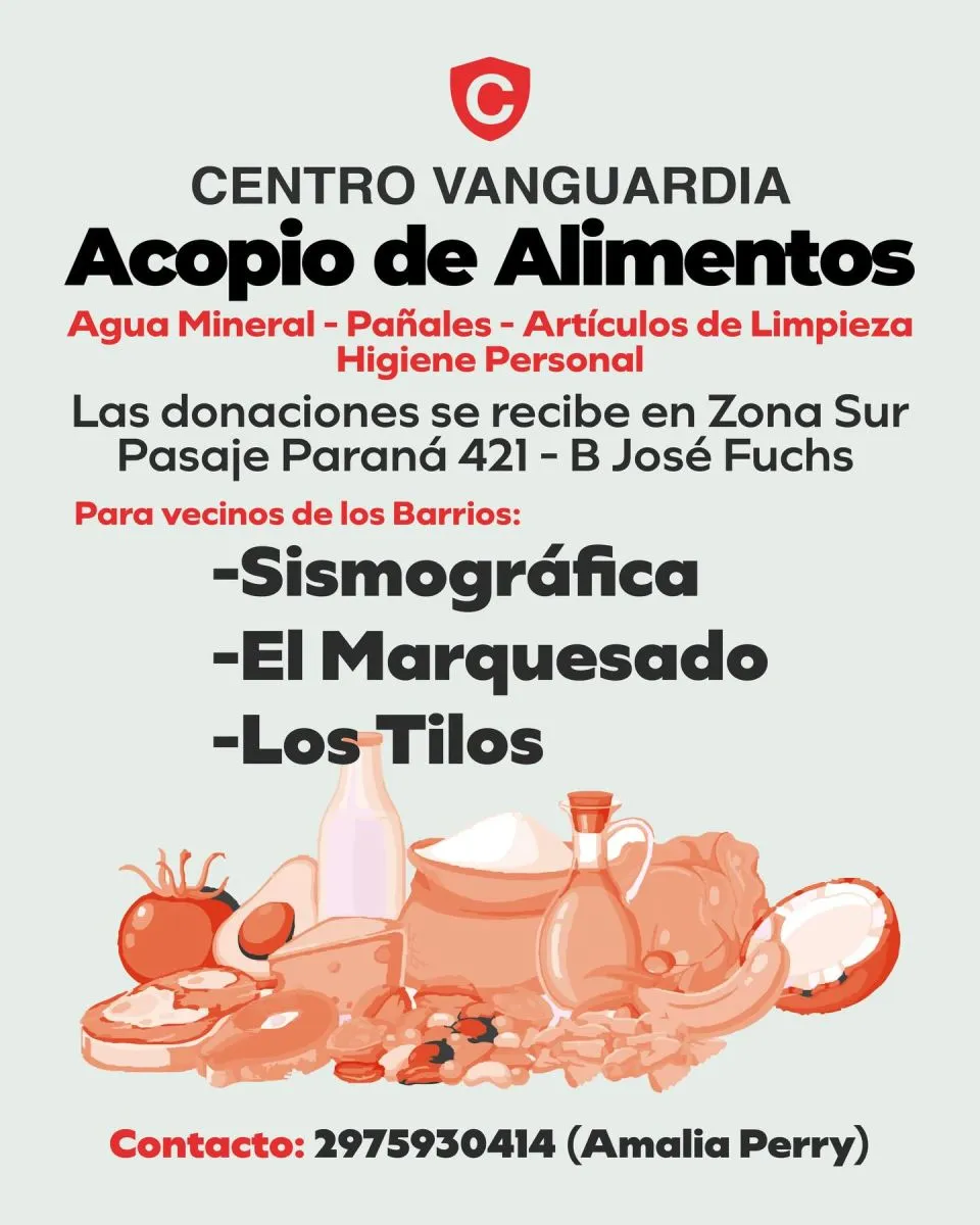 Al respecto, Amalia Perry, coordinadora del Centro Vanguardia, explicó que “arrancamos con la colecta y acopio en zona sur, en barrio José Fuchs, donde vamos a estar recibiendo alimentos, pañales, agua mineral, artículos de higiene personal y de limpieza”. En ese sentido, señaló que la iniciativa apunta a asistir a familias que “no están en un albergue, pero tuvieron que quedarse en otro lugar y tienen necesidades que no están siendo cubiertas”.