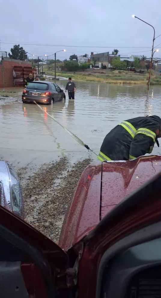 En paralelo, se recibieron múltiples llamados por vehículos atrapados o encajados a raíz del anegamiento y de la inestabilidad del terreno en distintos sectores de la ciudad, entre ellos Oneto 956, Ameghino y Rivadavia, Rosa de Wilson y Perito Moreno, y Calle 150 y Lago del Desierto. Mediante el uso de lingas y malacate, se logró rescatar y poner a salvo un total de cuatro rodados, que fueron trasladados a zonas firmes.