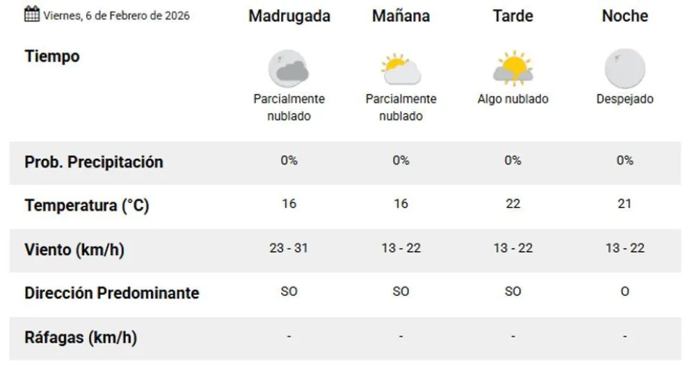 Para el viernes 6 de febrero, Crónica pudo confirmar que se espera una mejora en las condiciones. La jornada será estable, con una máxima que alcanzará los 22° por la tarde y cielo despejado hacia la noche, con una temperatura de 21°.
