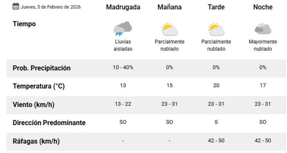 Hacia la tarde de este jueves, la temperatura máxima se ubicará en los 20°. Se esperan ráfagas de viento del sector sur que podrían alcanzar velocidades de entre 42 y 50 km/h.