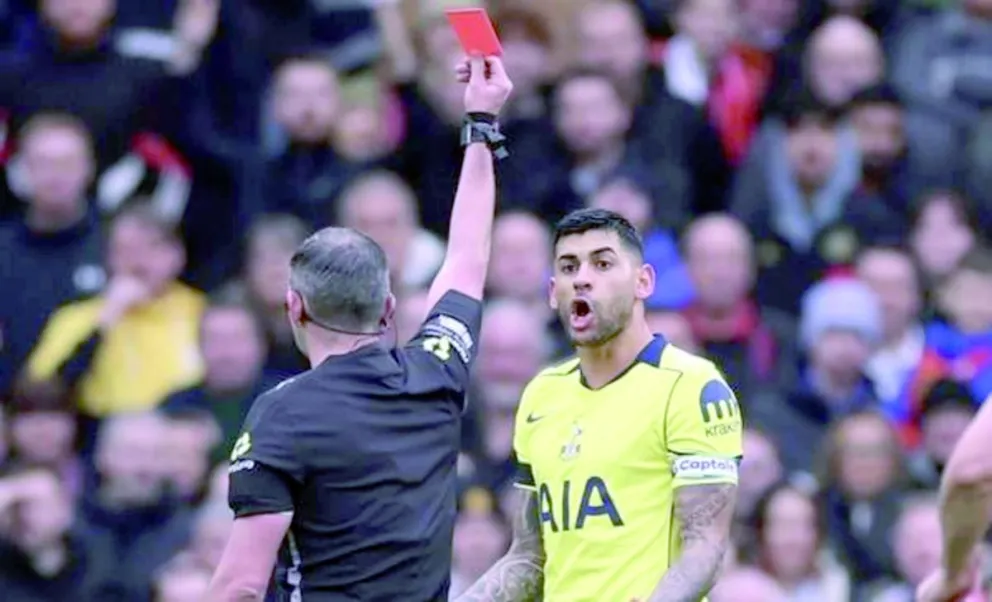 Cristian "Cuti" Romero fue expulsado a los 29 minutos del primer tiempo en la derrota de Tottenham por 2 a 0 ante Manchester United, disputada en Old Trafford por la Premier League, tras un planchazo sobre Casemiro que le valdrá una suspensión de cuatro fechas.