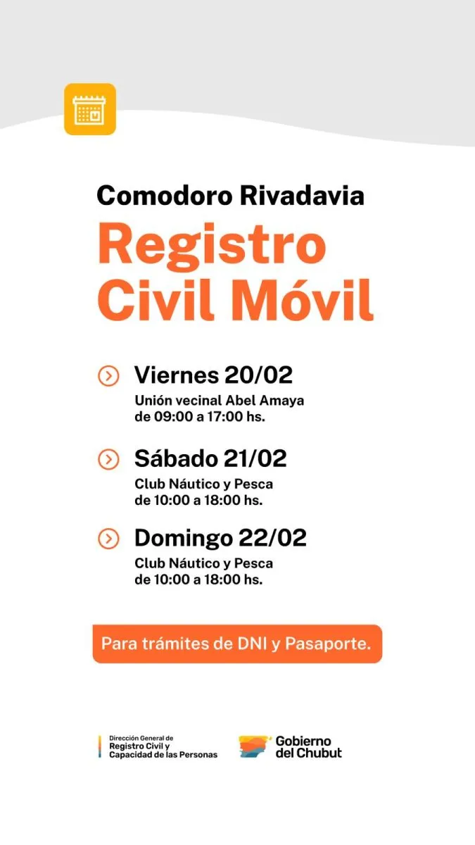El Gobierno del Chubut, a través del Ministerio de Gobierno, informa que la Unidad Móvil de Documentación del Registro Civil realizará un operativo para la toma de trámites de DNI en la ciudad de Comodoro Rivadavia, durante el mes de febrero.