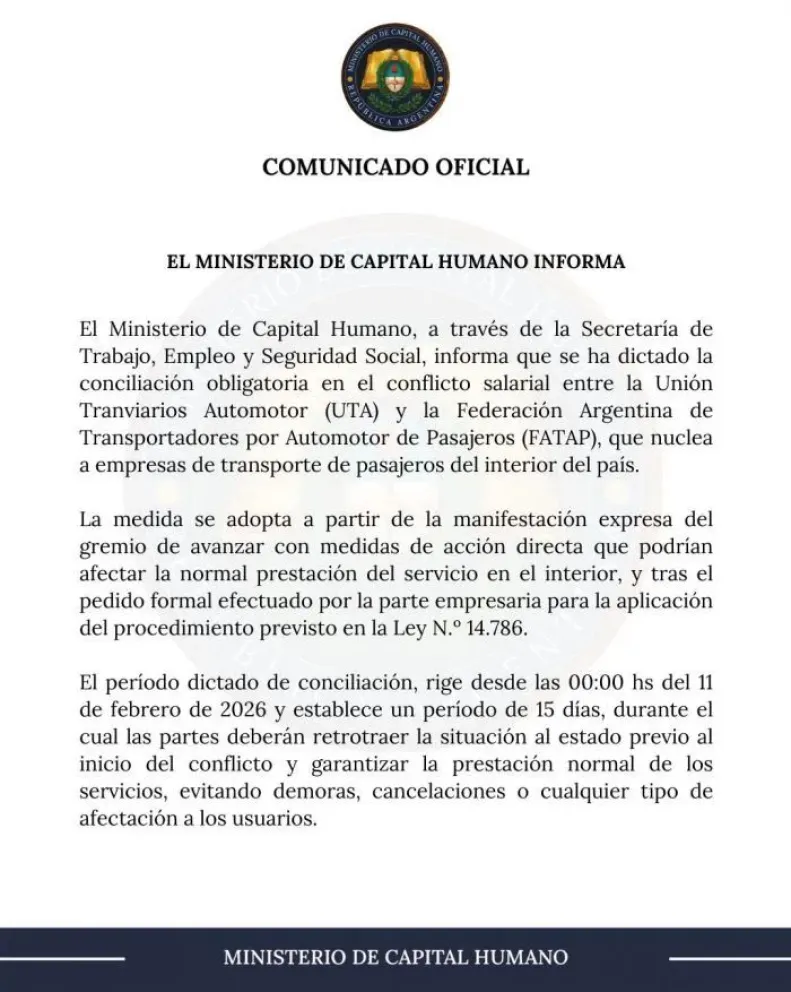 "El Ministerio de Capital Humano, a través de la Secretaría de Trabajo, Empleo y Seguridad Social, informa que se ha dictado la conciliación obligatoria en el conflicto salarial entre la Unión Tranviarios Automotor (UTA) y la Federación Argentina de Transportadores por Automotor de Pasajeros (FATAP). La medida se adopta a partir de la decisión expresa del gremio de avanzar con medidas de acción directa", apunta el comunicado.