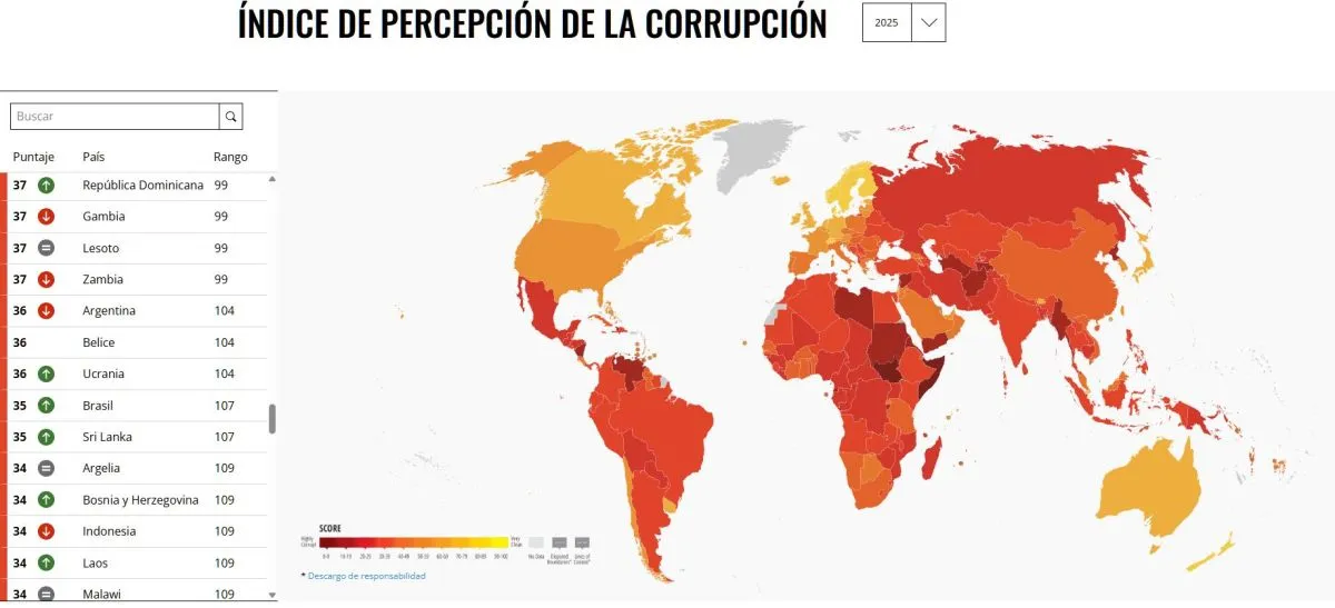 Según el informe anual de Transparencia Internacional, Argentina cayó cinco puestos en el ranking de Índice de Percepción de la Corrupción y pasó del puesto 99 en el 2024 al 104 en el 2025. Es el segundo año consecutivo que el país cae de puesto entre las 182 naciones que integran la lista.