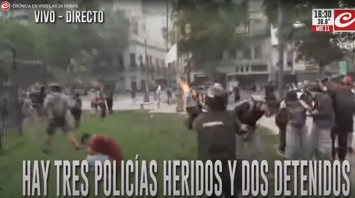 En medio de una jornada marcada por el rechazo al proyecto de reforma laboral, algunos sectores utilizaron bloques de madera como resguardo y arrojaron bombas molotov contra el personal policial.