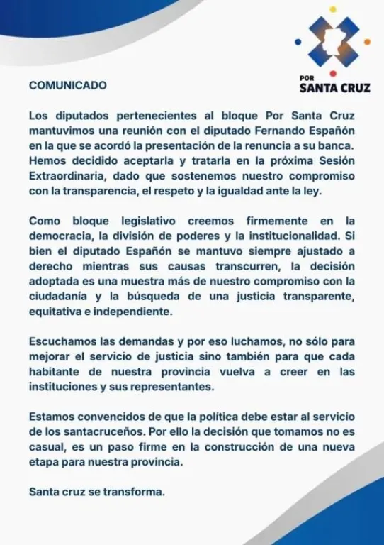 “Los diputados pertenecientes al bloque Por Santa Cruz mantuvimos una reunión con el diputado Fernando Españón en la que se acordó la presentación de la renuncia a su banca. Hemos decidido aceptarla y tratarla en la próxima Sesión Extraordinaria, dado que sostenemos nuestro compromiso con la transparencia, el respeto y la igualdad ante la ley”, señalaron.