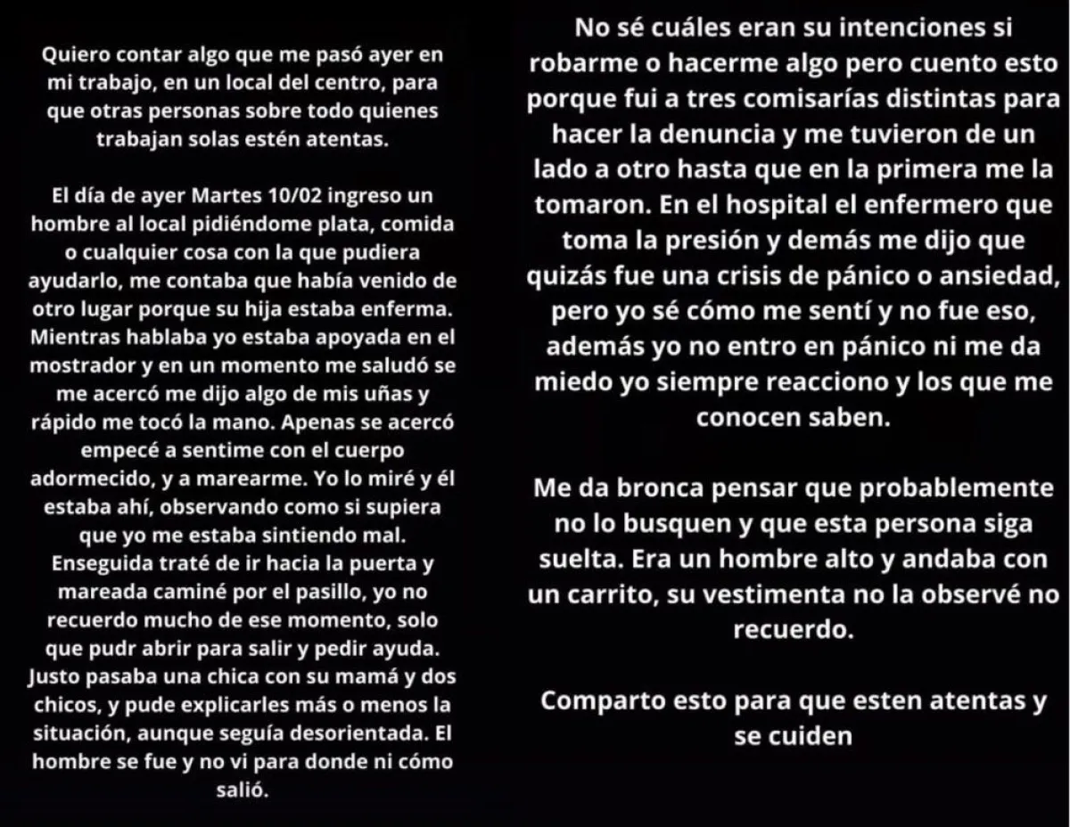 La mujer indicó en su publicación que, tras el episodio, acudió al hospital por sus propios medios. Desde la Policía señalaron que no cuentan con un certificado médico que acredite lesiones o la presencia de alguna sustancia.