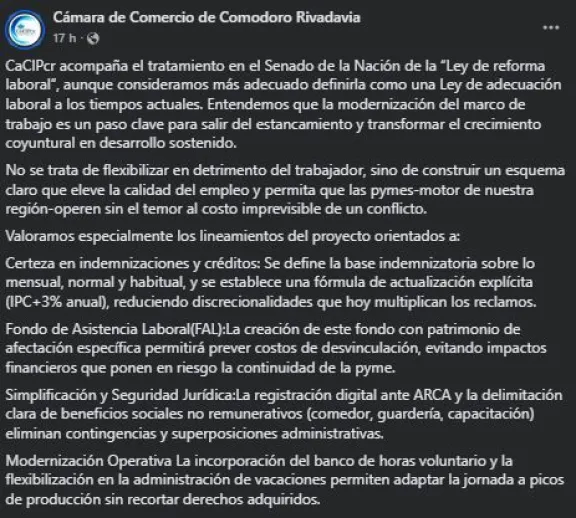 La Cámara de Comercio de Comodoro respaldó la reforma laboral