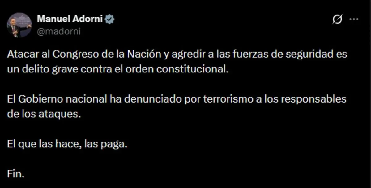 “Atacar al Congreso de la Nación y agredir a las fuerzas de seguridad es un delito grave contra el orden constitucional”, expresó Adorni a través de su cuenta en la red social X.
