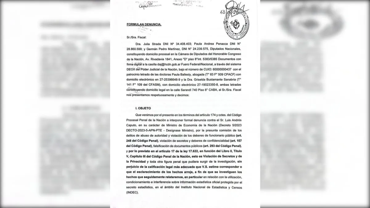 Los integrantes de la Cámara Baja nacional pertenecientes al bloque Unión por la Patria, Julia Strada, Germán Martínez y Paula Penacca, formalizaron este viernes una querella penal dirigida contra el titular de la cartera de Economía, Luis Caputo. La acción judicial se basa en recientes maniobras irregulares que habrían distorsionado el correcto desempeño del Instituto Nacional de Estadística y Censos (INDEC).