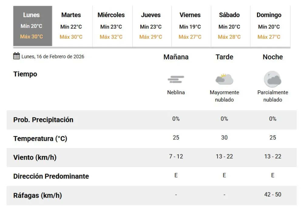 El martes 17 de febrero registrará un cambio en las condiciones climáticas con una temperatura máxima de 30 °C. Durante la tarde, se intensificará la velocidad del viento, lo que motivó la emisión de una alerta amarilla por parte del organismo nacional.
