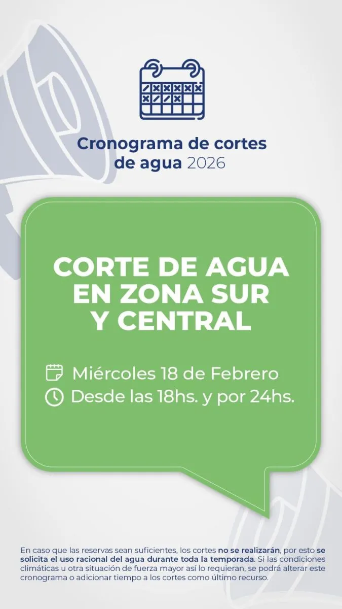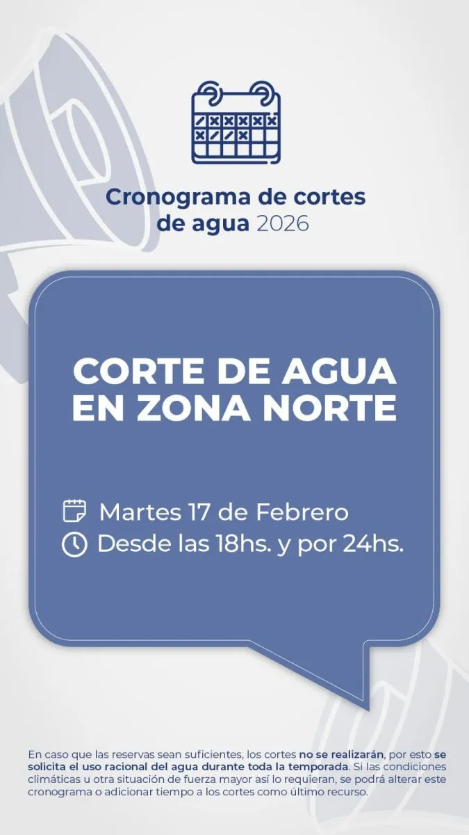 Este martes 17 de febrero, desde las 18 y por un lapso de 24 horas, la interrupción alcanza a Zona Norte. En tanto, el miércoles 18, también desde las 18 y durante 24 horas, el corte afectará a Zona Sur y Central.