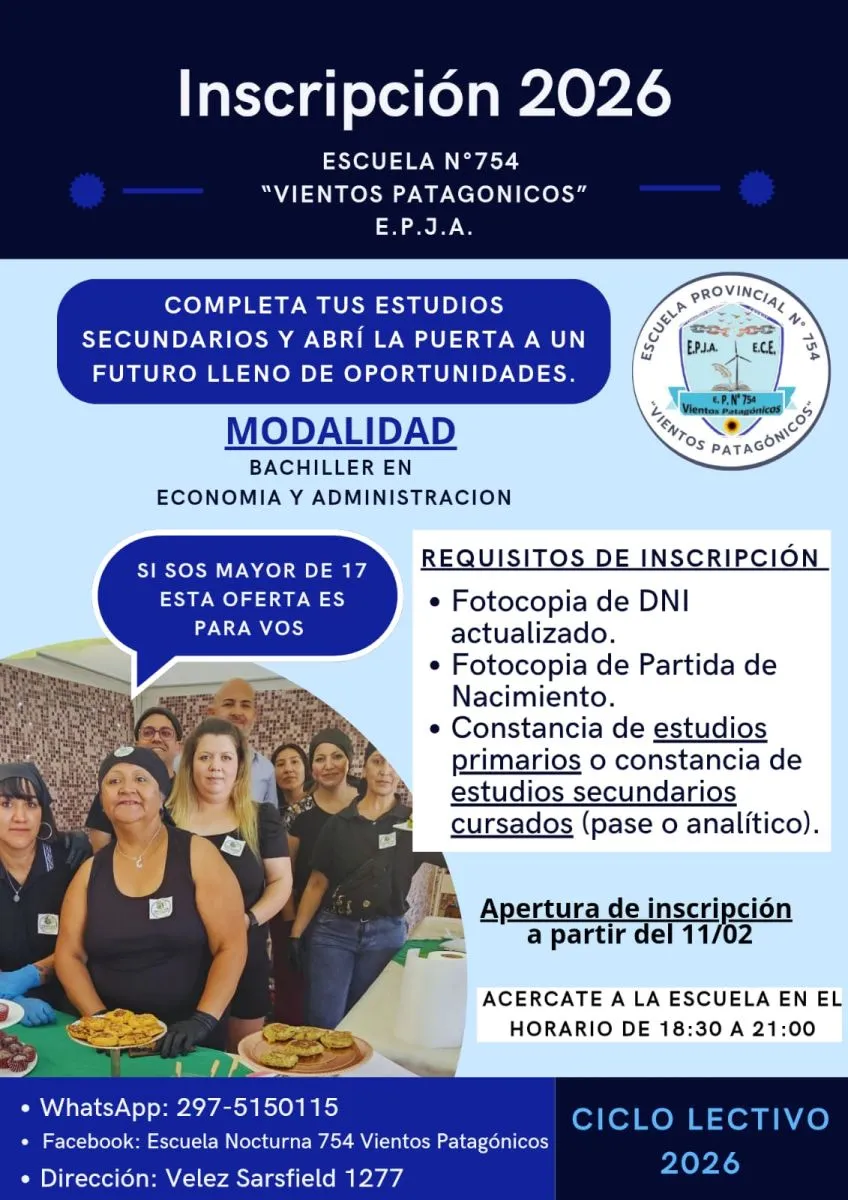 Para concretar la inscripción, pueden acercarse con la documentación requerida a la escuela, de lunes a viernes, de 18:30 a 21 horas, y por mayor información pueden consultar al teléfono celular 2975150115, o a través de Facebook en Escuela Nocturna 754 Vientos Patagónicos.