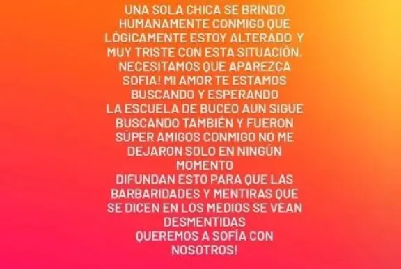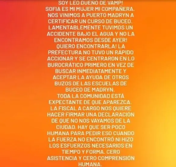 Asimismo, expresó su malestar ante el pedido de la fiscalía interviniente para que los testigos no abandonen la ciudad de Puerto Madryn. En sus declaraciones, señaló una presunta falta de asistencia y comprensión humana por parte de los organismos encargados de coordinar la búsqueda en la zona costera.