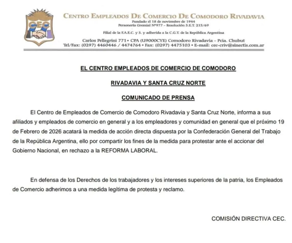 "En defensa de los derechos de los trabajadores y los intereses superiores de la patria, los empleados de comercio adherimos a una medida legítima de protesta y reclamo", expresaron desde la organización fundada en 1944.