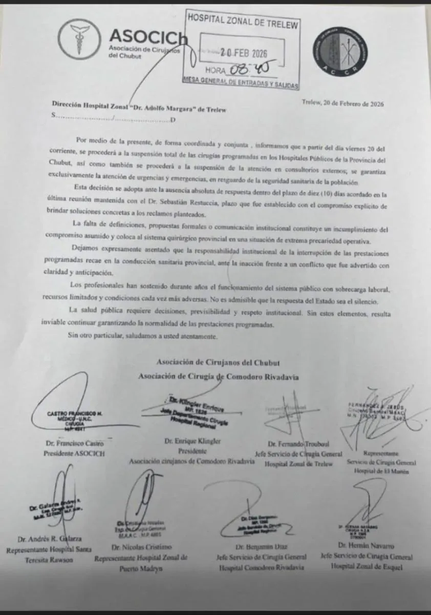 La decisión fue comunicada por la Asociación de Cirujanos del Chubut. Los profesionales indicaron que la medida se mantendrá hasta obtener respuestas concretas de la conducción sanitaria sobre los reclamos planteados oportunamente por el sector.