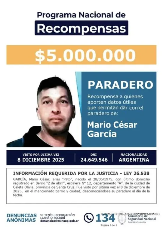 El Gobierno nacional, a través del Ministerio de Seguridad, oficializó el ofrecimiento de una recompensa para obtener datos precisos sobre el paradero de Mario César García. El hombre permanece desaparecido desde hace más de dos meses en la zona norte de la provincia de Santa Cruz.