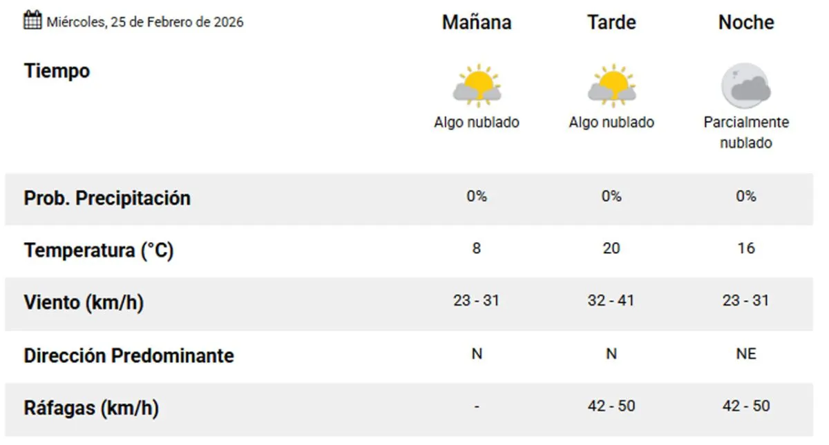 Por la tarde el cielo continuará sin lluvias y el viento rotará al noreste, alcanzando velocidades moderadas de hasta 31 km/h. Para la noche se prevén condiciones similares, con ráfagas del noreste en torno a los 30 km/h.