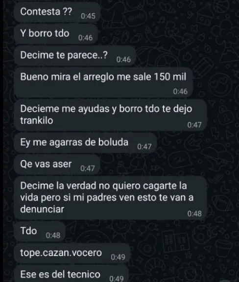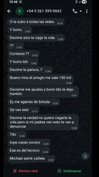 “Me decía que era menor de edad, que le diera plata; la bloquee y automáticamente me escribieron desde otro numero diciéndome que era el padre y que le depositara plata para que la semana que viene no me denunciara”, describió.
