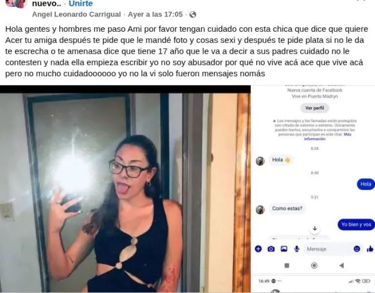 En el caso original que dio lugar a este otro hecho de “sextorsión” ocurrido en los últimos días en Puerto Madryn el damnificado había publicado en su perfil de Facebook alertando que tuvieran cuidado con una muchacha, de la que publico la foto, que pedía ser “amiga” y que después de un intercambio de mensajes solicitaba que le mandaran fotos intimas.