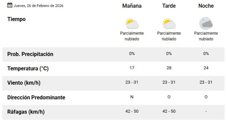 Por la tarde continuará el tiempo estable, sin lluvias previstas, acompañado por vientos moderados del noroeste de 24 km/h.