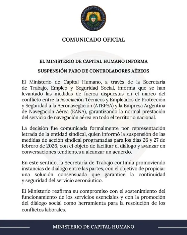 El paro de controladores aéreos anunciado para este jueves 26 y viernes 27 de febrero fue suspendido y los vuelos operarán con normalidad en todo el país. Así lo confirmó el Ministerio de Capital Humano a través de un comunicado oficial.