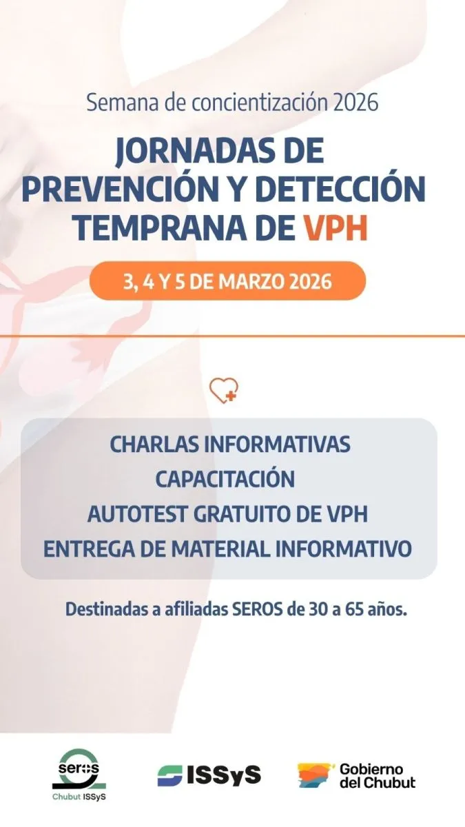 El Instituto de Seguridad Social y Seguros del Chubut (ISSyS), a través de su obra social SEROS, desarrollará jornadas especiales durante la Semana de Concientización sobre el Virus del Papiloma Humano (VPH), reforzando su política de prevención y detección temprana del cáncer de cuello uterino.