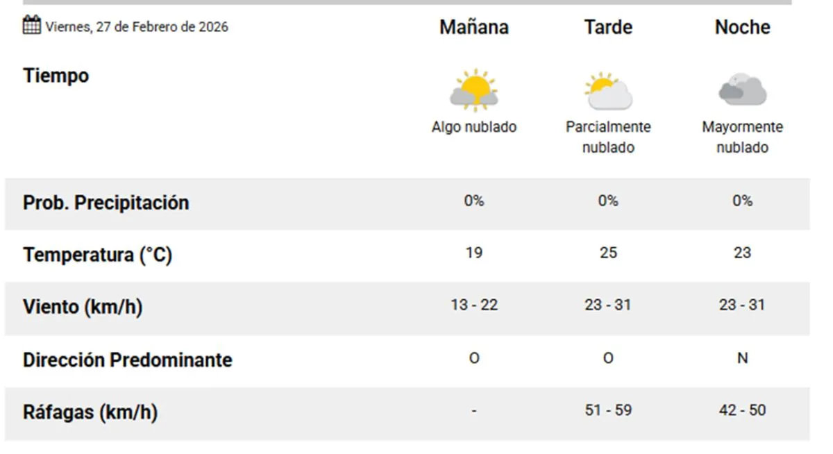 Por la noche, las condiciones se mantendrán similares, con cielo sin precipitaciones y vientos moderados del norte a 25 km/h.