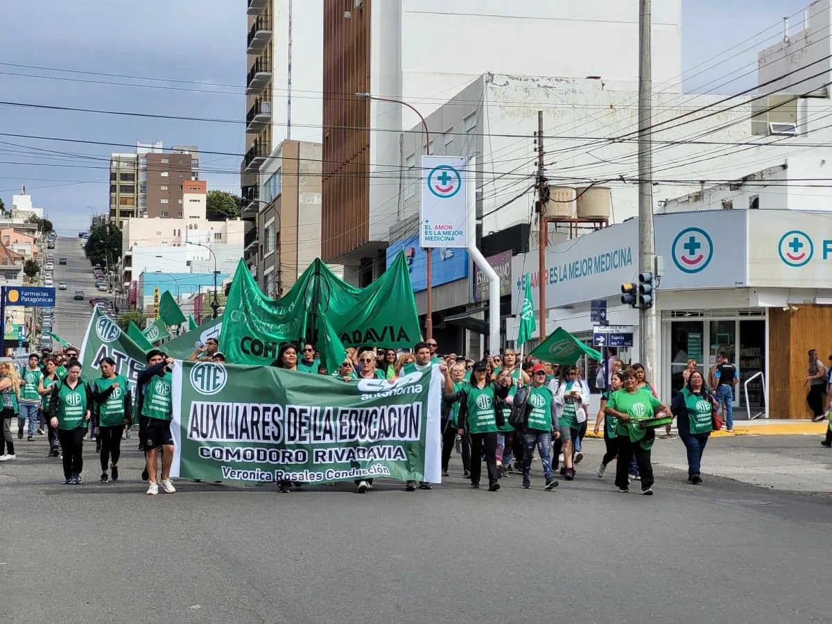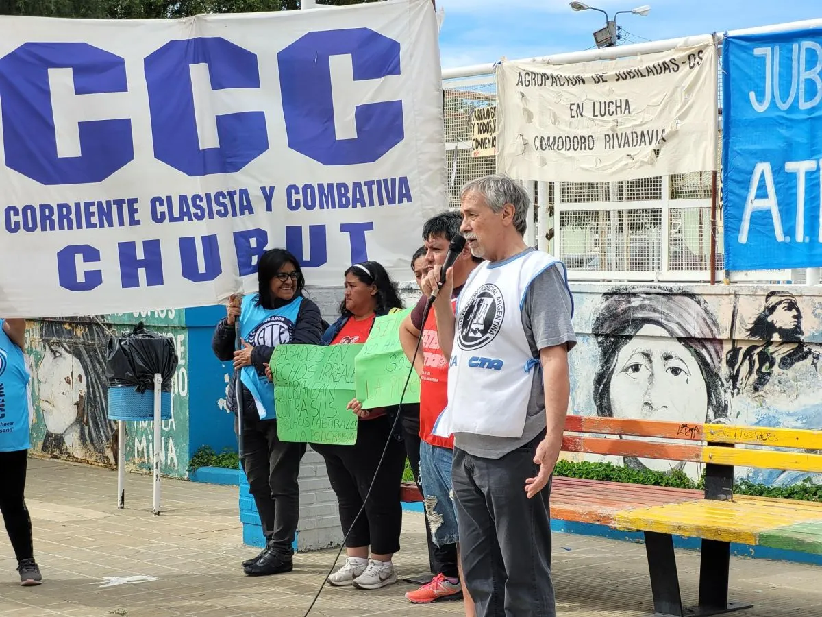 La concentración principal se llevó adelante en la plaza de la Escuela 83. Participaron referentes de ATECh, ADU, SITRAJUCH, APUNP, CTA, organizaciones sociales y jubilados, entre otros sectores.