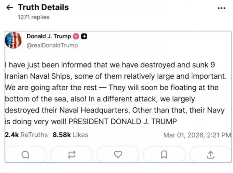 “Acabo de ser informado de que hemos destruido y hundido 9 barcos de la Marina iraní, algunos de ellos relativamente grandes e importantes”, escribió Trump en su publicación.