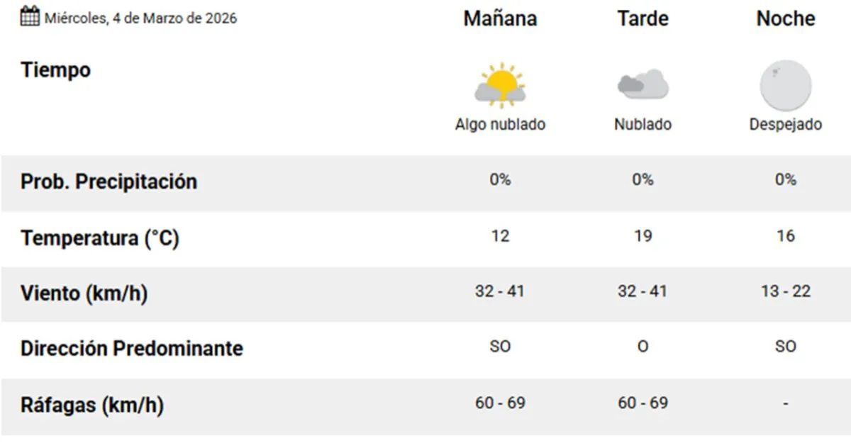 Durante la madrugada y primeras horas de la mañana el cielo se mantendrá sin precipitaciones, con vientos fuertes del oeste de 40 km/h y ráfagas que podrían alcanzar los 69 km/h.