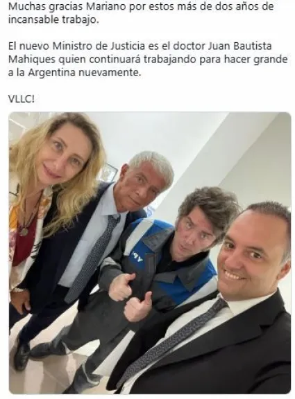 “Muchas gracias Mariano por estos más de dos años de incansable trabajo”, escribió el mandatario en su cuenta de X. Luego confirmó: “El nuevo ministro de Justicia es el doctor Juan Bautista Mahiques, quien continuará trabajando para hacer grande a la Argentina nuevamente”.