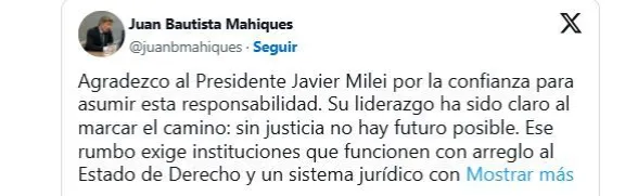 Tras su designación, el flamante ministro agradeció públicamente al Presidente: “Agradezco al Presidente Javier Milei por la confianza para asumir esta responsabilidad. Su liderazgo ha sido claro al marcar el camino: sin justicia no hay futuro posible”.