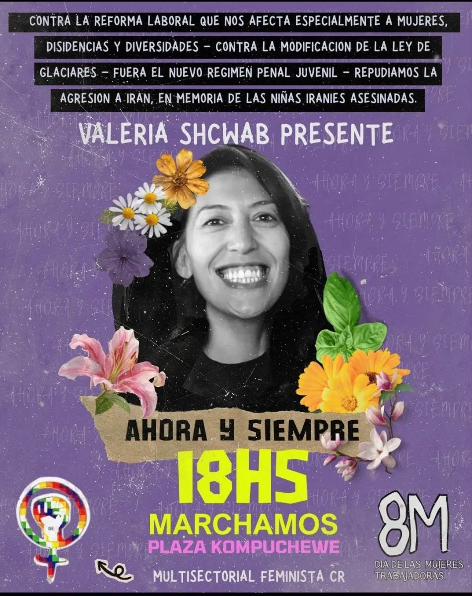 También se expresa un repudio a agresiones en el plano internacional y se convoca a marchar en memoria de mujeres víctimas de violencia. En ese marco, aparece la consigna “Valeria Schwab presente, ahora y siempre”, en referencia al femicidio que conmocionó a la ciudad.