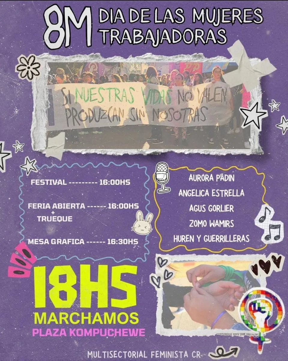 Este sábado 8 de marzo se realizará en Comodoro Rivadavia una nueva movilización en el marco del Día de las Mujeres Trabajadoras. La convocatoria es a las 18 horas en la Plaza Kompuchewe, bajo la organización de la Multisectorial Feminista CR.