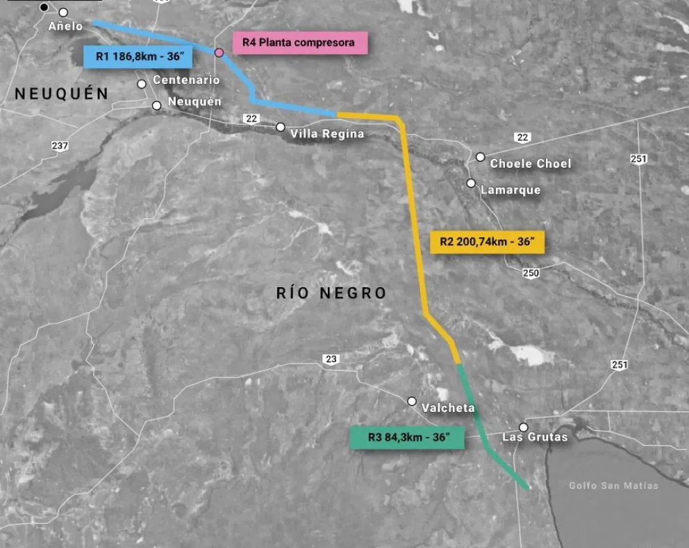 Para asegurar el abastecimiento del recurso durante todo el año, SESA llevará adelante la construcción de un gasoducto propio desde la formación Vaca Muerta hasta el Golfo San Matías. La compañía ya realizó la compra de los ductos de 36 pulgadas a la empresa india Welspun por un monto cercano a los US$200 millones.