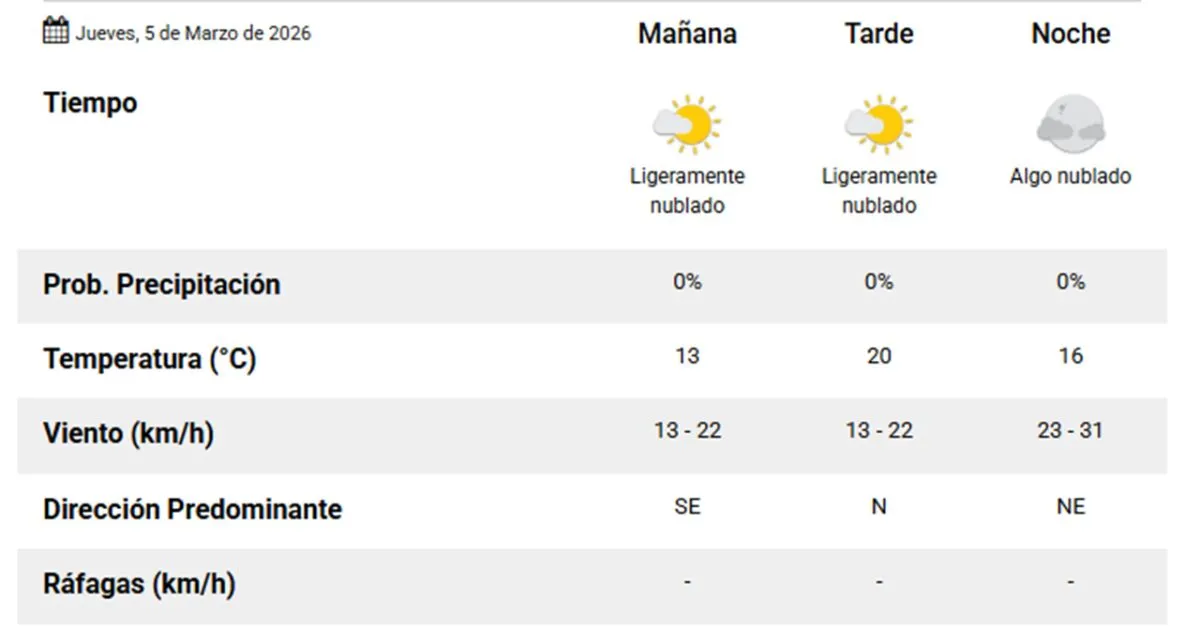 Hacia la noche, el pronóstico indica que tampoco se registrarán precipitaciones y los vientos serán moderados del noreste, con velocidades cercanas a 20 km/h.