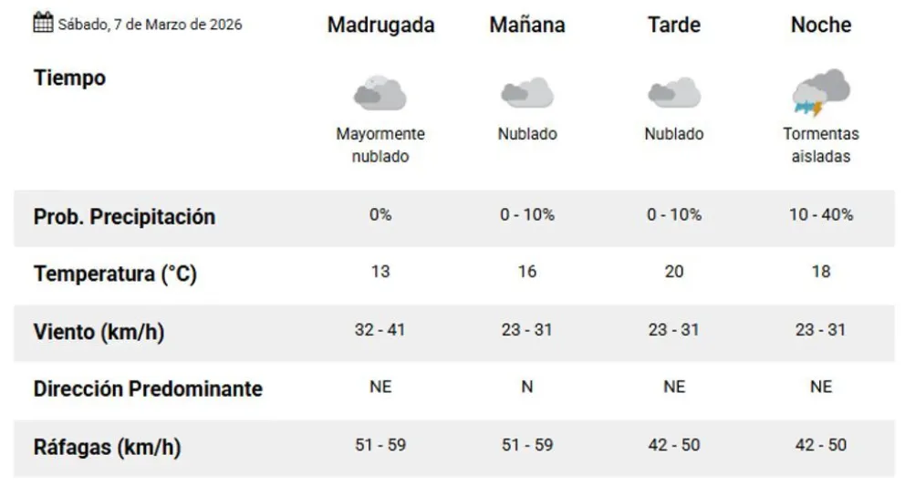 En horas de la tarde y la noche, el pronóstico advierte sobre el desarrollo de tormentas aisladas. La temperatura máxima se ubicará en los 23 grados, mientras que las ráfagas de viento podrían intensificarse al finalizar el día, alcanzando velocidades de entre 60 y 69 kilómetros por hora.